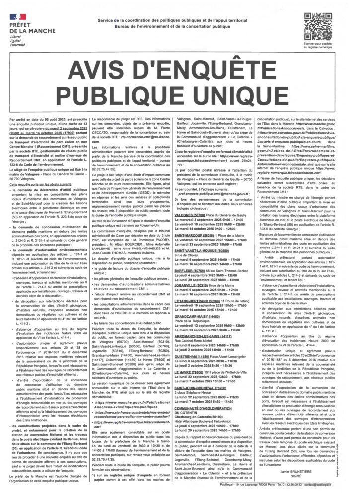 Informe le public qu’il sera procédé sur le territoire de la commune de Grandcamp-Maisy, conformément à l’arrêté du Maire n° 2025-09 du 28 mars 2025, à une Participation du Public par Voie Electronique (PPVE) préalable à la délivrance du permis d’aménager n° 014 312 25
